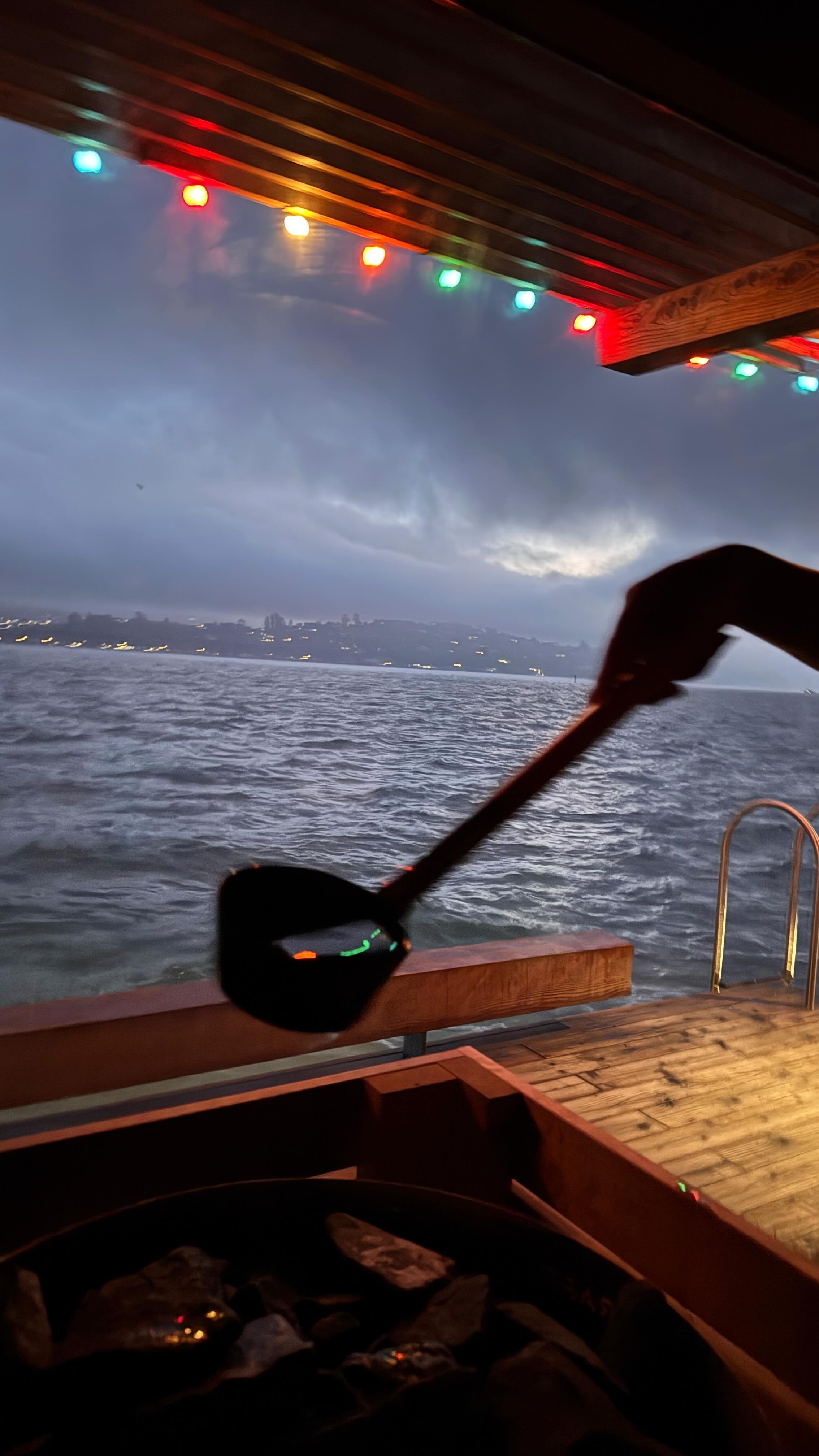The North Sauna sits flush against the edge of the vessel, with nothing below you but the water. It has a larger door for ADA access. The deck is slightly smaller, but the view is dramatic. Particularly great for afternoon sun and moody weather.